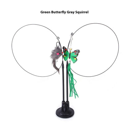 Interactive cat teaser toy with a suction cup base. Features various color and animal attachments to keep cats engaged and active. Made from durable plastic (PP). Suitable for stimulating play and exercise. Dimensions: 300x250x40mm. Includes: 1 cat teaser.